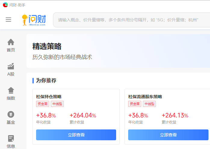 3.在 问财-助手浏览器 中点击 精选策略 ,打开精选策略窗口