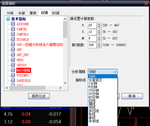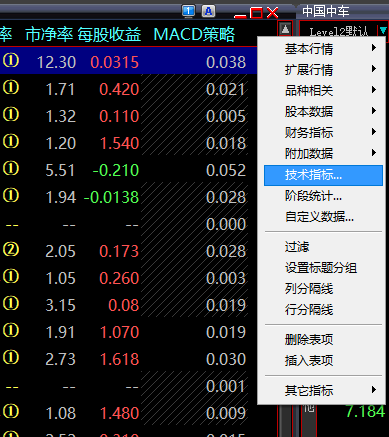 3. 在报价表 表头右键菜单 选择指标, 并选择 MACD交易 指标,运行周期选择分时, 你也可以选择日线等其他周期,但记得下载数据。设置参数(做T股数).就可以了。你可以根据模板改成适合自己的交易策略