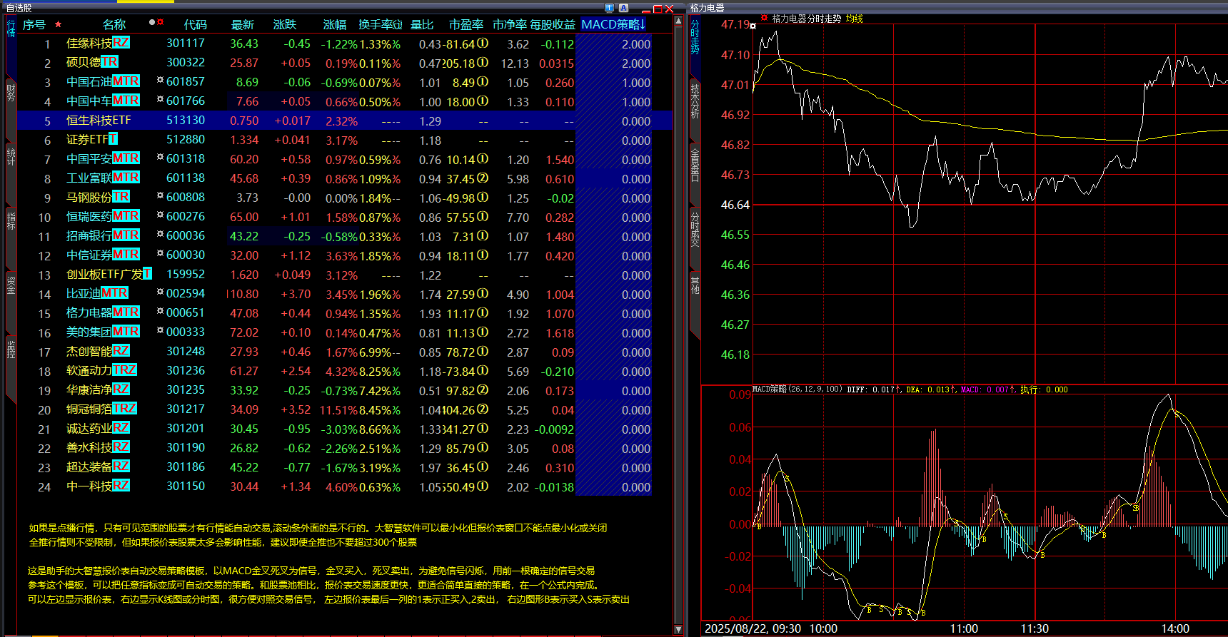 大智慧实现图表交易的方式最好是通过在报价表上运行技术指标,这种方式比在技术分析或分时图运行指标更适合运行多个股票。跟股票池方式相比则反应速度更快,这对于需要快速行情的超短线意义重大,比如实现自己的打板策略。也可以很方便调试公式。