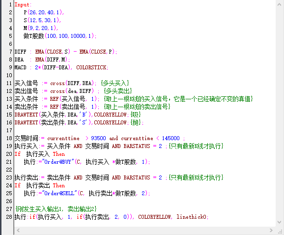 这是助手的大智慧报价表自动交易策略模板,以MACD金叉死叉为信号,金叉买入,死叉卖出,为避免信号闪烁,用前一根确定的信号交易