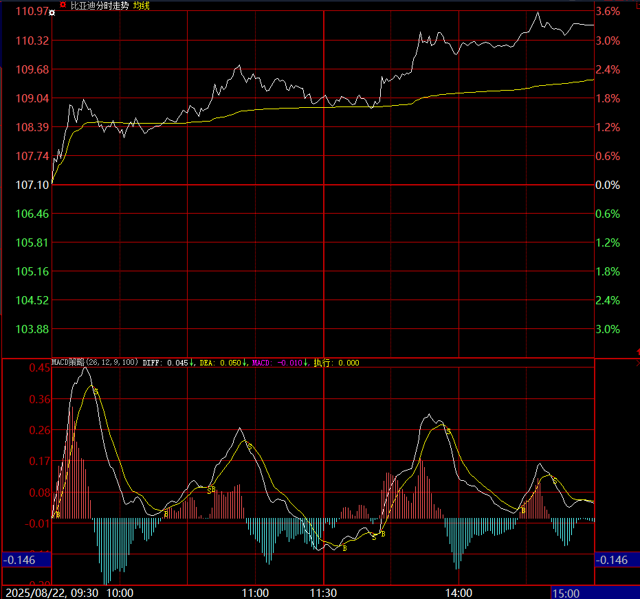 可以左边显示报价表,右边显示K线图或分时图,很方便对照交易信号, 左边报价表最后一列的1表示正买入,2卖出, 右边图形B表示买入S表示卖出